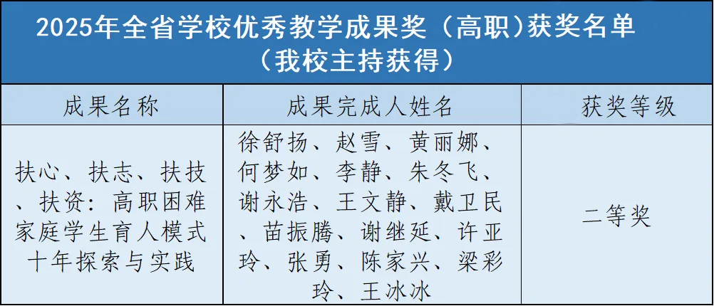 我校牵头申报的两项成果均荣获二等奖,以精准定位与扎实实践赢得评审专家认可。其中,《扶心・扶志・扶技・扶资:高职困难家庭学生育人模式十年探索与实践》,深耕十年构建了全链条资助育人体系,通过心理疏导、精神激励、技能培育、资源保障四维发力,实现从 “经济帮扶” 到 “全面赋能”的育人升级,让困难家庭学生在成长路上不掉队、有奔头,为高职院校资助育人工作提供了可复制、可推广的 “碧职样本”。另一项主持成果《五位融通・六方协同・七维驱动:新型职业农民培育模式探索与实践》,紧扣乡村振兴战略需求,整合校地企社多方资源,构建了特色种养人才精准培育体系,为县域农业产业升级注入了技能人才活力,充分体现了学校服务地方发展的责任担当碧职院。