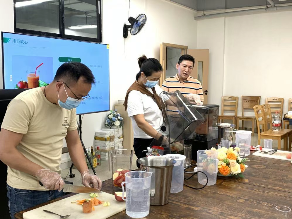 从绿色饮品配方到蔬果榨汁搭配,他生动讲解原料特性与搭配逻辑,如“羽衣甘蓝配黄瓜,口感清新,如初春的绿芽”,学员们听得入神。