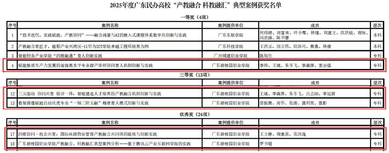 获奖是对学校长期致力于产教融合育人模式改革的充分肯定。案例人才培养、产业学院、校企合作、高水平专业群等层面,系统构建了“产+学+研+创”育人路径,为学生实践能力提升与地方服务提供了有效支撑。成果不仅提升了学校在同类兄弟院校中的影响力,也为广东民办高校深化产教融合、推动科教融汇提供了可借鉴的实践经验,进一步助力学校高质量发展与高水平应用型人才培养。